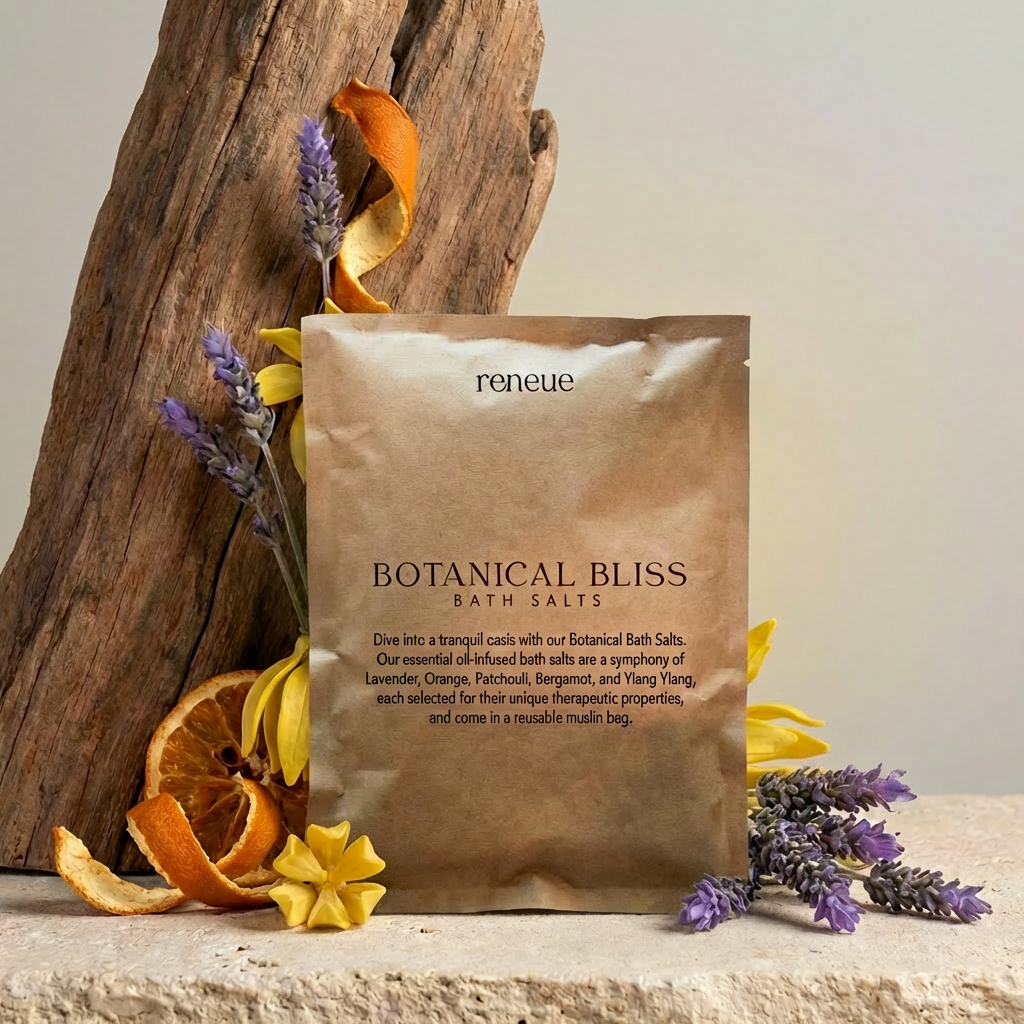 Dive into a tranquil oasis with our Botanical Bath Salts. Our essential oil-infused bath salts are a symphony of Lavender, Orange, Patchouli, Bergamot, and Ylang Ylang, each selected for their unique therapeutic properties.